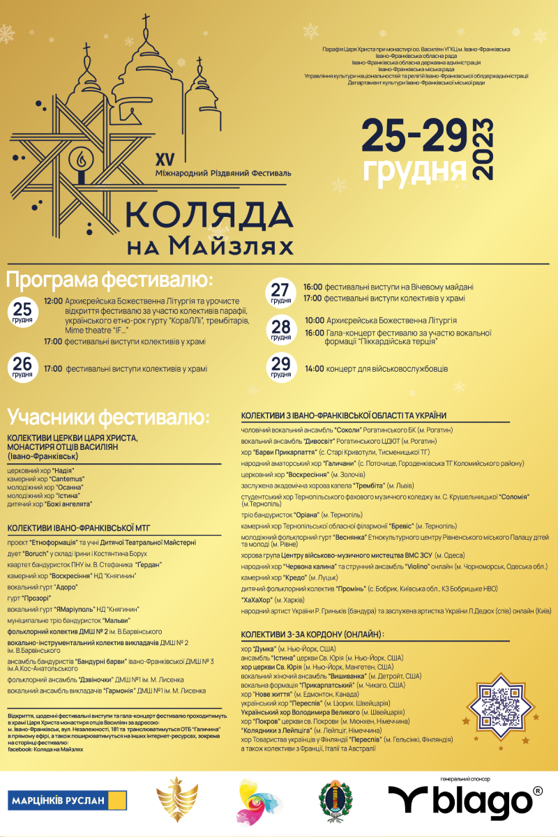 Нагадаємо, Різдвяний фестиваль “Коляда на Майзлях” був започаткований 2010 року при монастирі Царя Христа отців Василіян Української Греко-Католицької церкви міста Івано-Франківськ. Головна мета – відновлення, збереження та поширення різдвяних традицій, колядок, щедрівок, а також обмін творчими досягненнями мистецьких колективів.