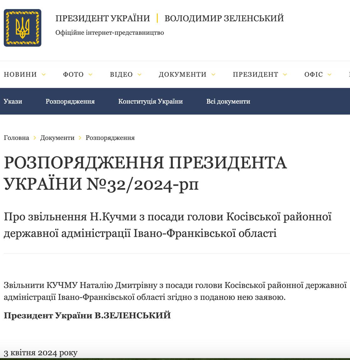«Звільнити КУЧМУ Наталію Дмитрівну з посади голови Косівської районної державної адміністрації Івано-Франківської області згідно з поданою нею заявою», – йдеться у документі.