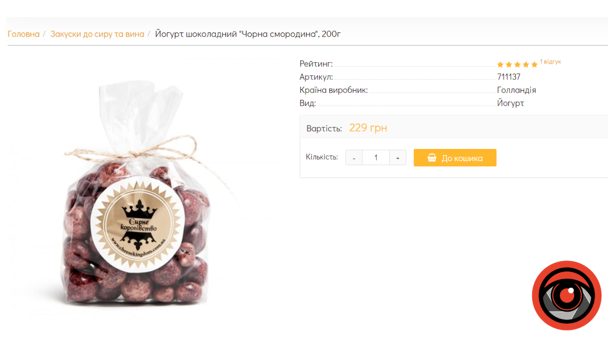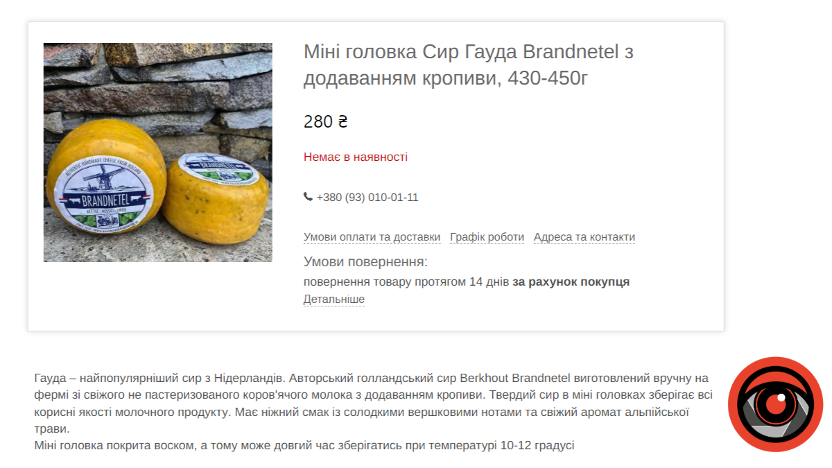 Скрін з веб-магазину сирів