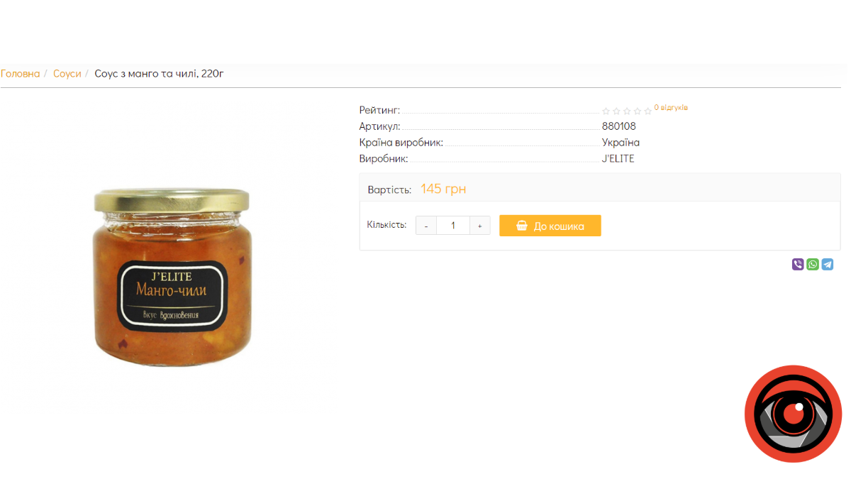 6. Соус “Манго-чилі” коштує 145 гривень при виборі онлайн та 165 гривень у магазині міста, вага 220 грамів.