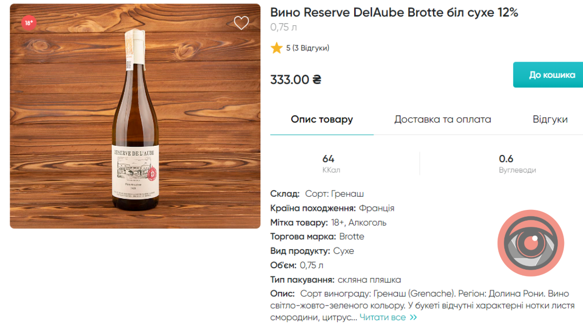 На онлайн-платформах вартість вина коливається від 333 до 292 гривень (остання зі знижкою). Виробник — Франція.