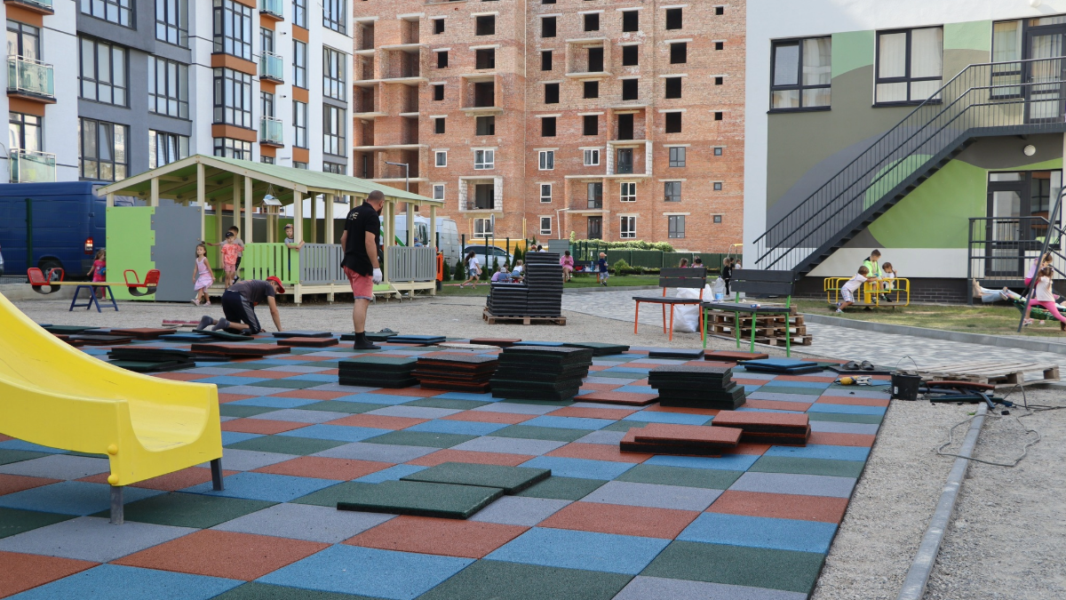 На фінішному етапі зараз знаходиться облаштування прогулянкової території біля гірок спеціальним гумовим покриттям в закладі дошкільної освіти “Джерельце”. Сьогодні вона виглядає ось так: