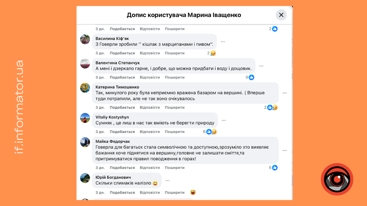 Невдоволені туристи висловлюють своє обурення щодо торгівлі на Говерлі в соцмережах. Головна думка – на Говерлі має бути краса природи, а не базар.