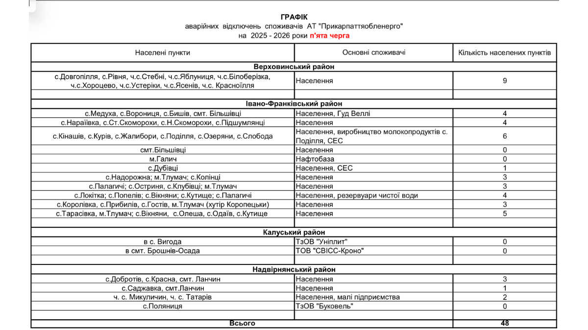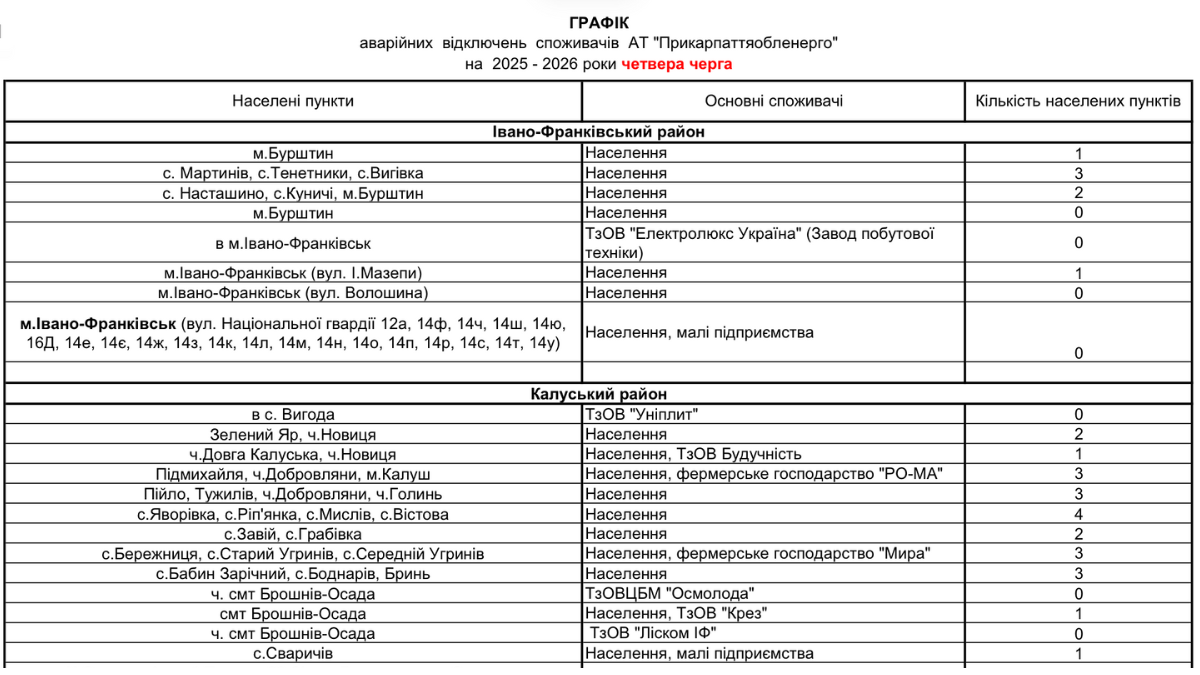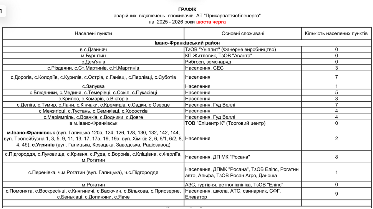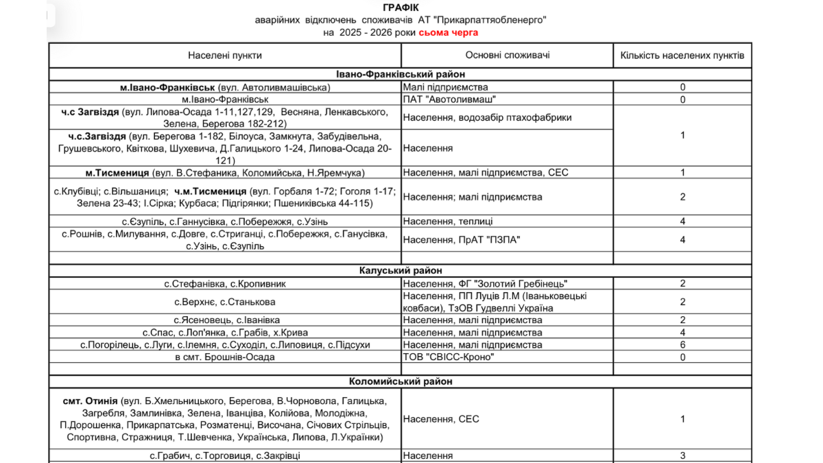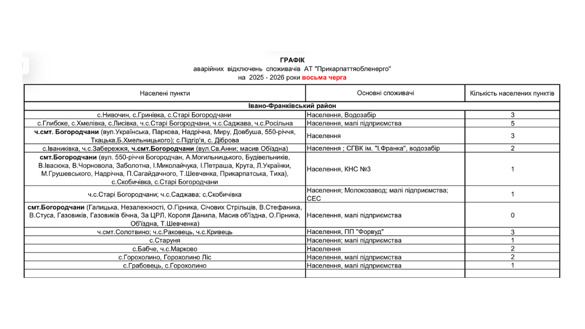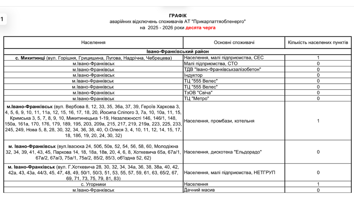 Інформатор Івано-Франківськ ділиться повним переліком з покликанням на Прикарпаттяобленерго.