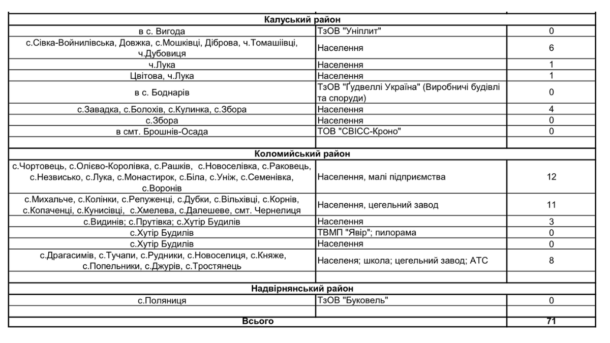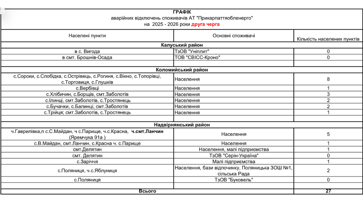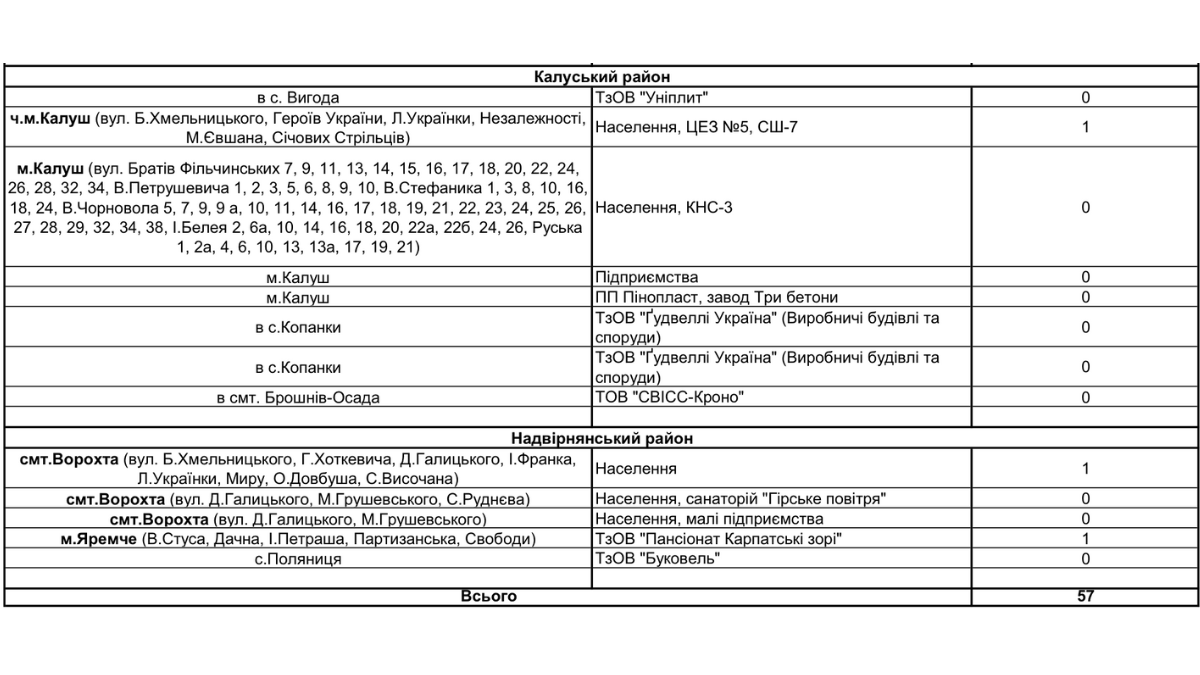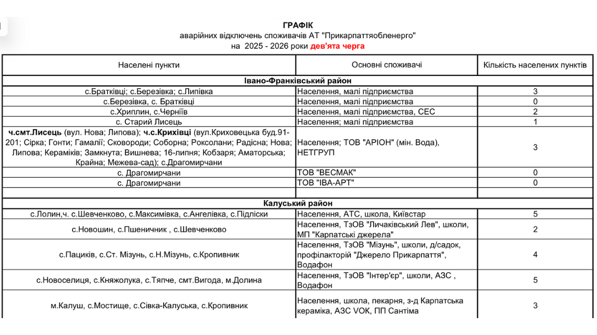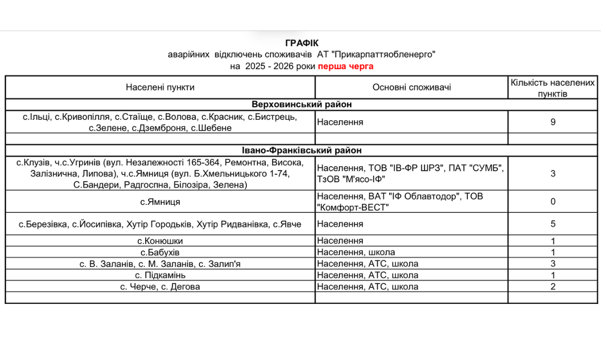 Інформатор Івано-Франківськ ділиться повним переліком з покликанням на Прикарпаттяобленерго.