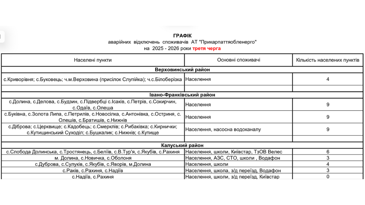 15 жовтня на Прикарпатті запроваджували аварійні вимкнення. Всіх користувачів поділили на 10 черг. До якої з них належить ваша домівка?
