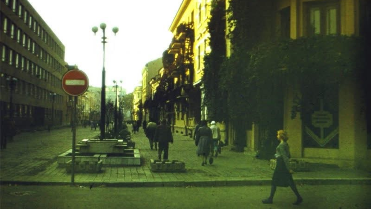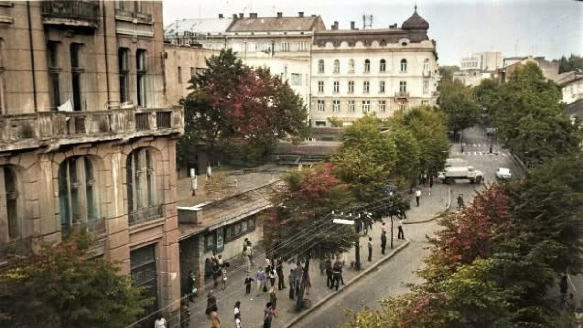 Так виглядала вулиця Січових Стрільців (тоді Чапаєва) з балкону готелю “Дністер” в серпні 1984 року. У центрі фото можна помітити автобусну зупинку “Пошта”.