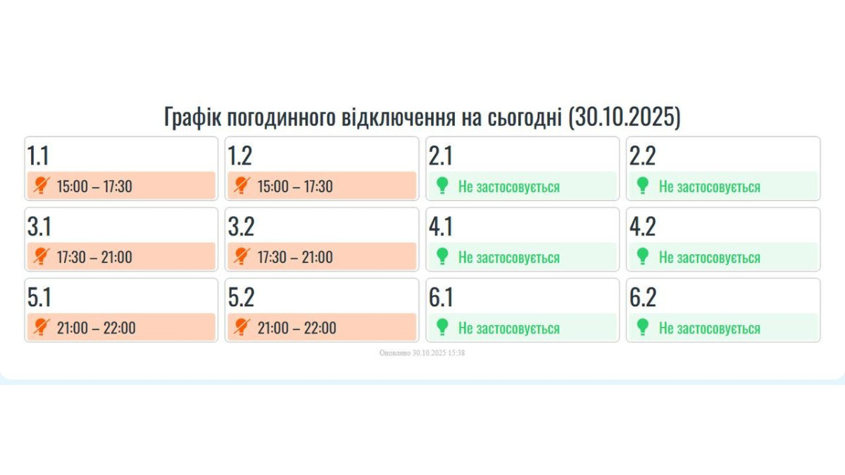 З 15:00 до 22:00 на Прикарпатті будуть застосовуватись графіки погодинних відключень (ГПВ) в обсязі однієї черги. Причина застосування обмежень – наслідки масованої ракетно-дронової атаки на енергооб’єкти 30 жовтня