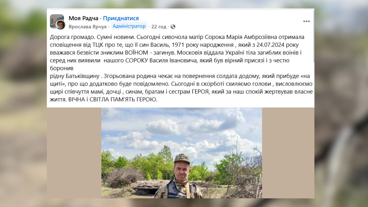 «Московія віддала Україні тіла загиблих воінів і серед них виявили нашого СОРОКУ Василя Івановича, який був вірний присязі і з честю боронив рідну Батьківщину . Згорьована родина чекає на повернення солдата додому, який прибуде «на щиті», про що додатково буде повідомлено», – йдеться в дописі.