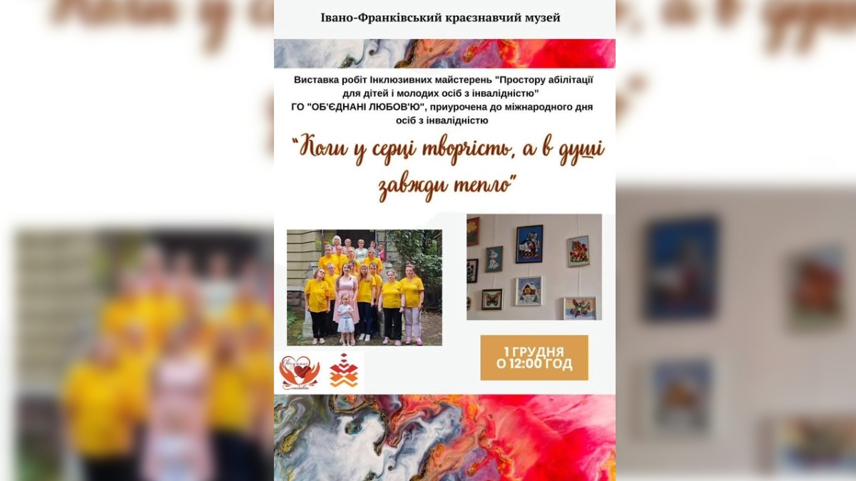 Івано-Франківський краєзнавчий музей презентує виставку робіт вихованців Інклюзивних майстерень «Простору абілітації для дітей і молодих осіб з інвалідністю» ГО “Обʼєднані любовʼю”, присвячену Міжнародному дню осіб з інвалідністю.