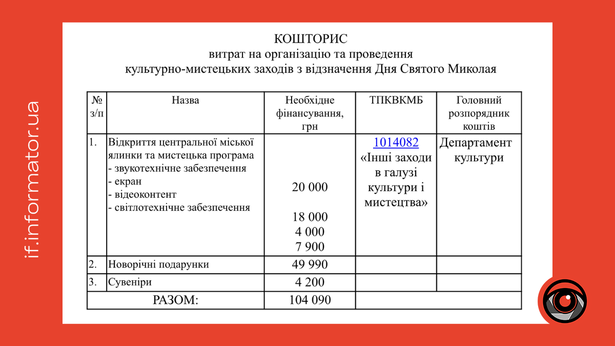 Згідно із кошторисом, на всі події виділили 104 090 грн. З них — майже 50 тис грн коштуватимуть новорічні подарунки.