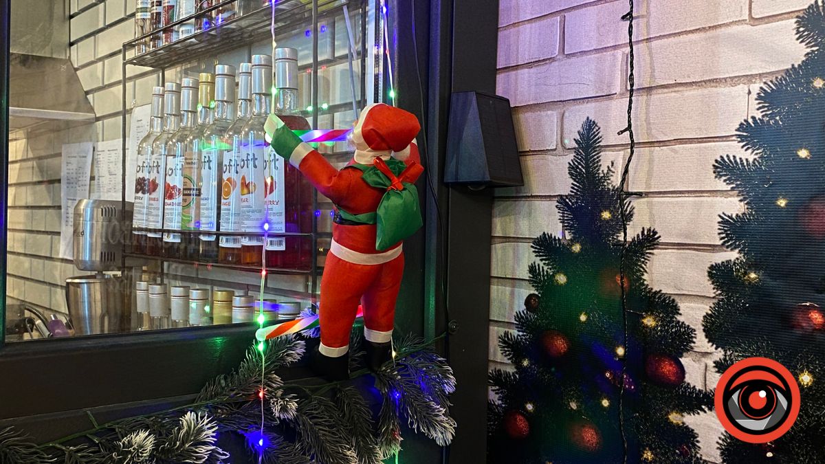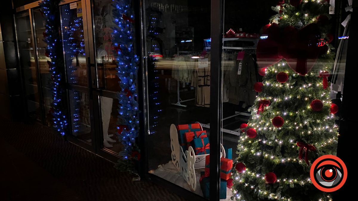На вході багатьох закладів видніються ялинки з різноманітними кульками, іграшками та мерехтливими гірляндами.