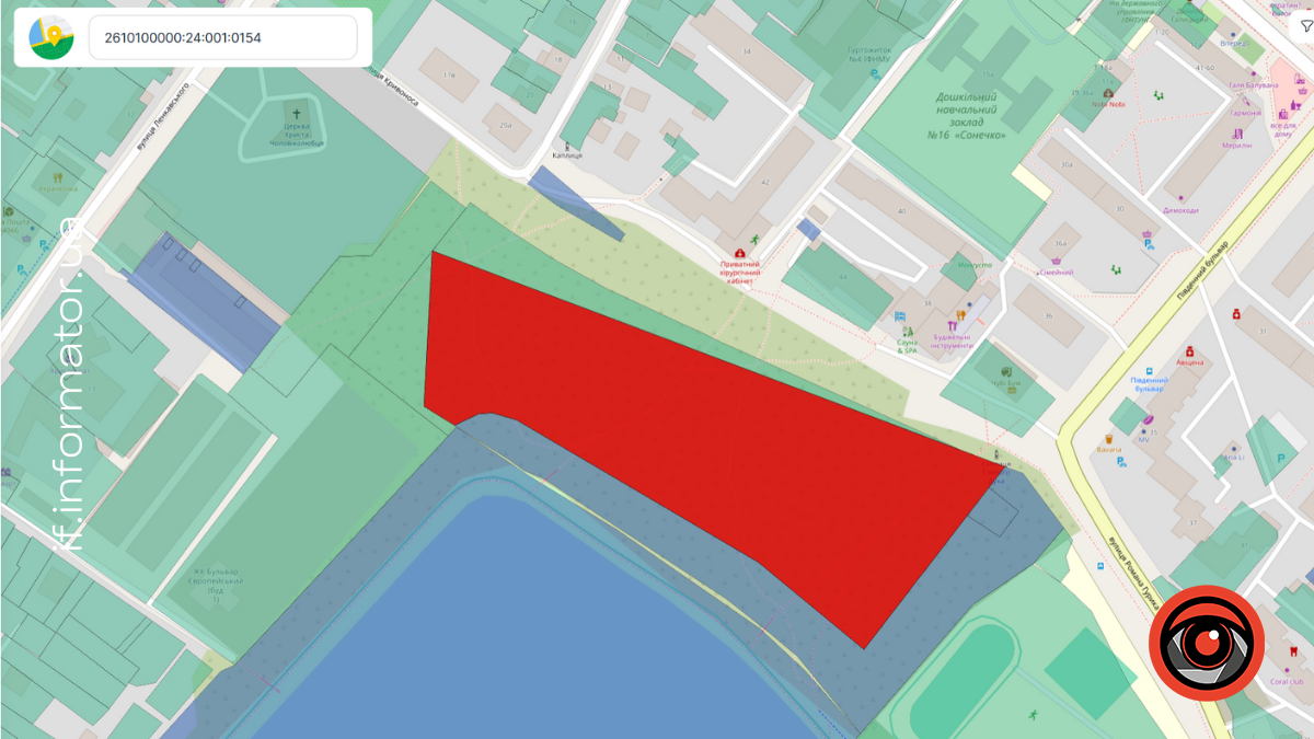 Джерело головного фото — кадастрова карта України. Червоним кольором позначена земельна ділянка з кадастровим номером 2610100000:24:001:0154.