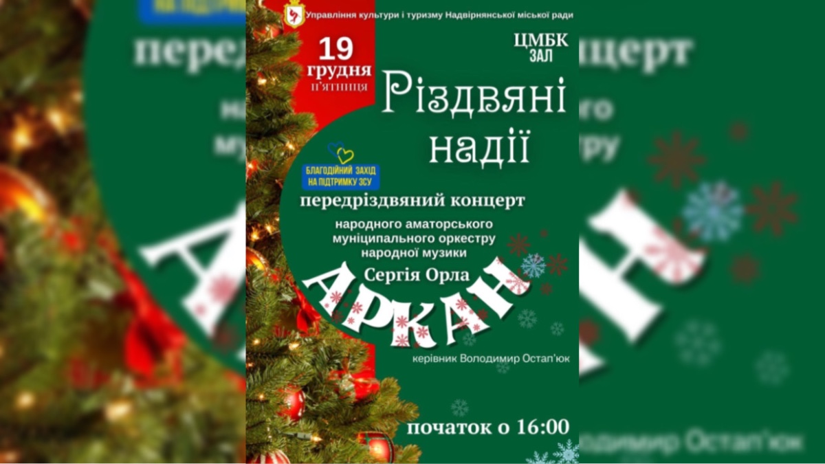 У рамках проєкту «Від Різдва до Перемоги» відбудеться святковий концерт народного аматорського оркестру народної музики «Аркан» Надвірнянського ЦМБК. Колектив підготував насичену різдвяну програму з новими творами, народною музикою та широкою палітрою сольних номерів.