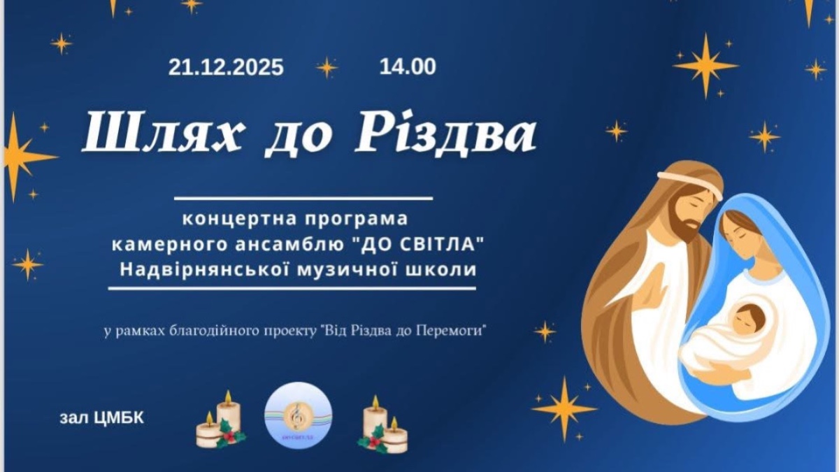 Камерний ансамбль Надвірнянської музичної школи «До Світла» представить різдвяну концертну програму «Шлях до Різдва». Захід відбудеться в межах благодійного проєкту «Від Різдва до Перемоги».