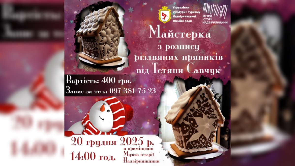 Музей історії Надвірнянщини запрошує на традиційну різдвяну майстерку від Тетяни Савчук. Учасники розписуватимуть 3D пряникову хатинку, експериментуватимуть з техніками декору, поринуть у святкову атмосферу та зможуть задонатити на ЗСУ.