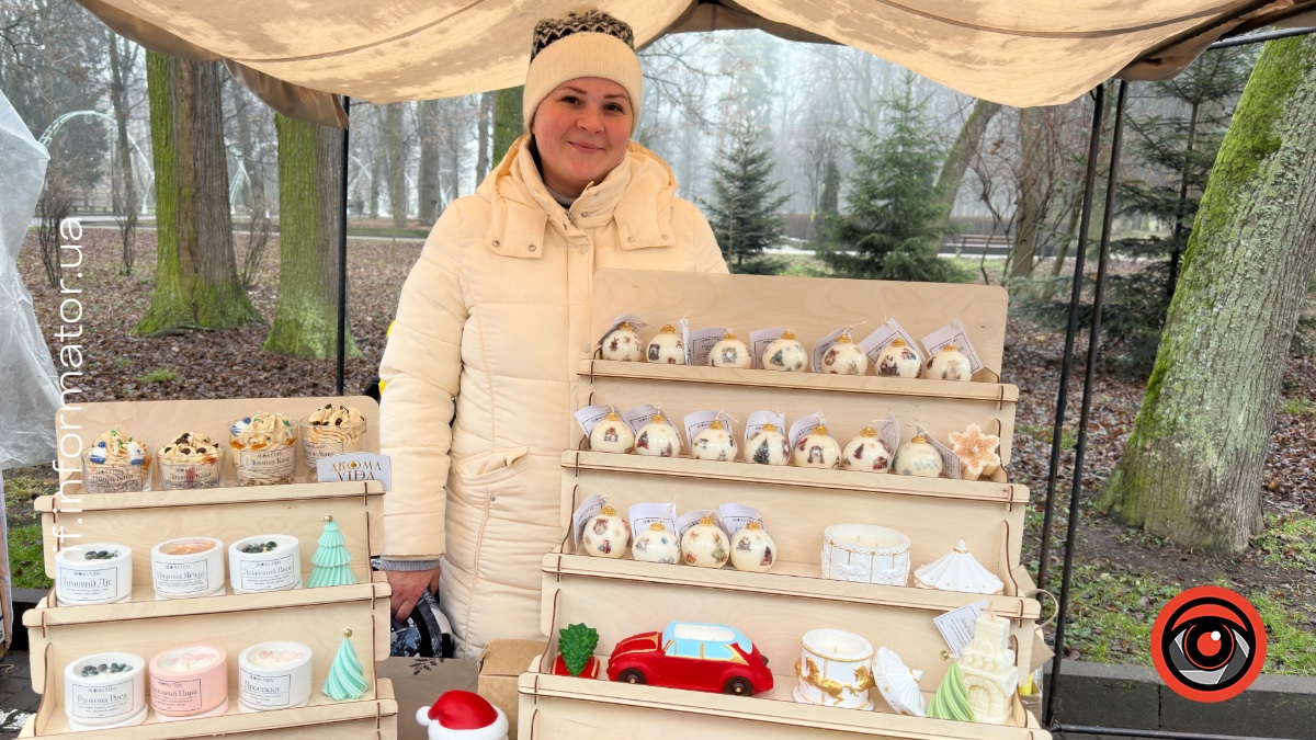 «У мене є невеличка кімната у будинку і там моя майстерня, тобто це «totaly handmade» (з англ. повністю ручна робота – ред.). Усі свічки з соєвого і кокосового воску, десь бленд (змішаний – ред.), а десь – чистий. Парафіну немає, немає і шкідливих домішок, а всі ароматизатори – парфумовані, тобто вони розкриваються у декілька етапів. Також ароматизатори сертифіковані, я їх замовляю у США. Тобто вся продукція екологічна і однозначно безпечна», – зазначає учасниця різдвяного ярмарку.