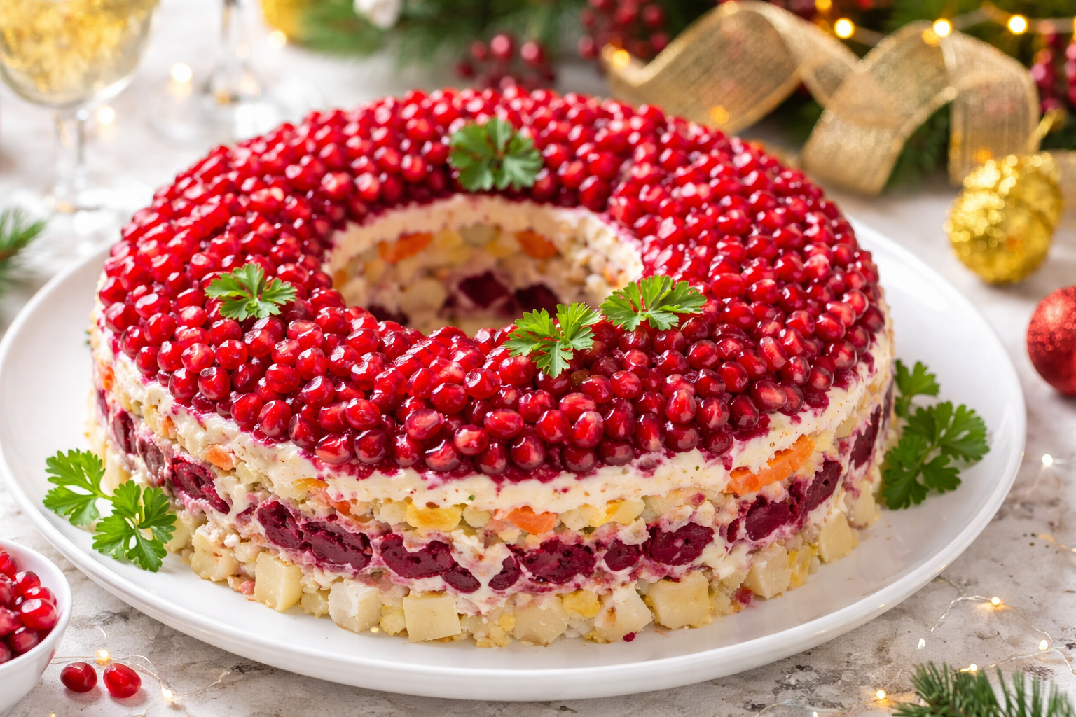 Страву викладають шарами, а зверху прикрашають зернами граната, що створює ефектний вигляд, подібний до святкового браслета.