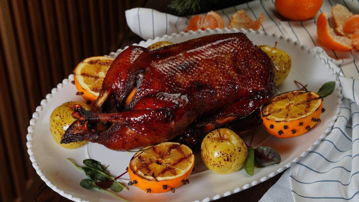 Качку маринують із медом, соєвим соусом і спеціями, начиняють яблуками та запікають у духовці до золотистої скоринки.
