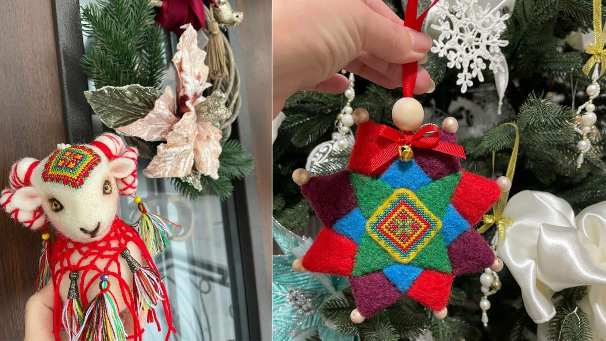 Окрім цього, майстриня виготовила ялинкову прикрасу у формі зірки, виконану у техніці сухого валяння. Центр композиції прикрашений орнаментом, що нагадує традиційну українську вишивку, а промені доповнені дерев’яними елементами. Завершує прикрасу червоний бант із золотистим дзвіночком.