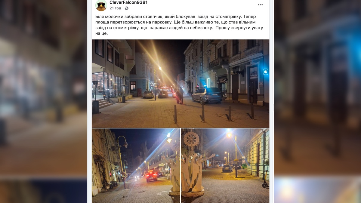 На відсутності обмежувальних стовпчиків та самовільному паркуванні у забороненому місці наголосили користувачі Facebook.