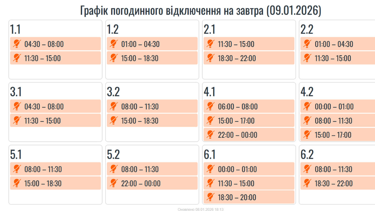 Нижче наводимо графіки відключень світла від Прикарпаттяобленерго на 9 січня.