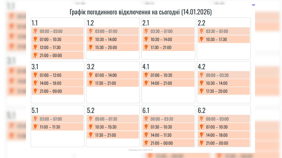 Нижче наводимо графіки відключень світла на 14 січня. Оновлення від 14.01.2026 о 9:56