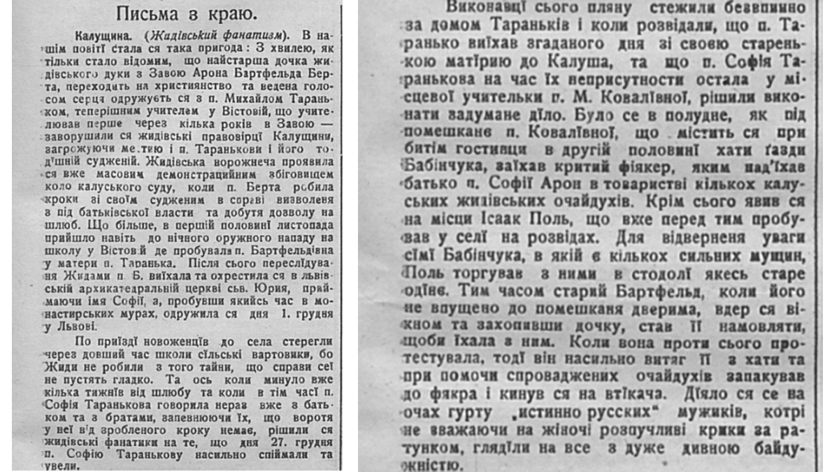 Наведений нижче текст є публікацією з галицької газети «Діло» за 13 січня 1913 р. Він описує події на Калущині, пов’язані з переходом єврейки у християнство, її шлюбом із українським учителем та подальшим насильницьким викраденням. Цитуємо уривок тексту з газети: