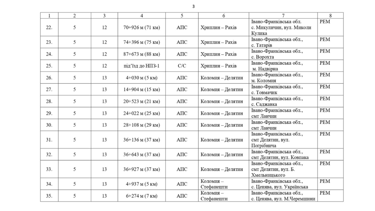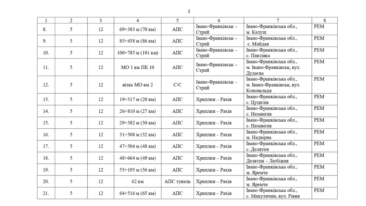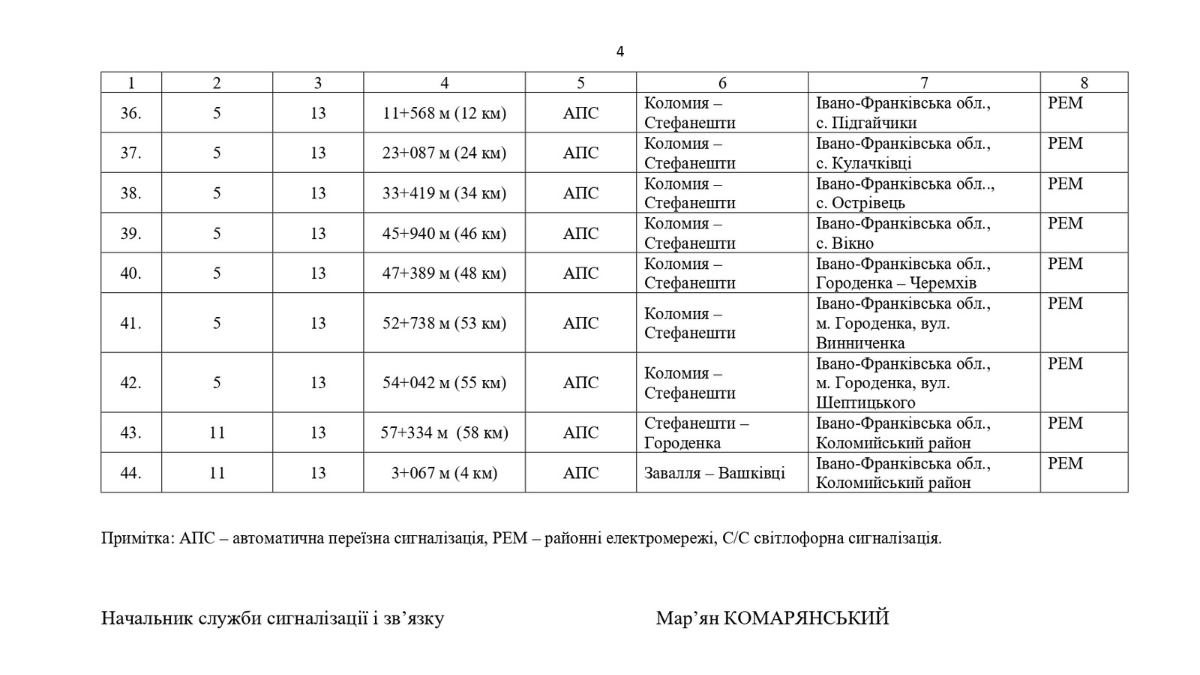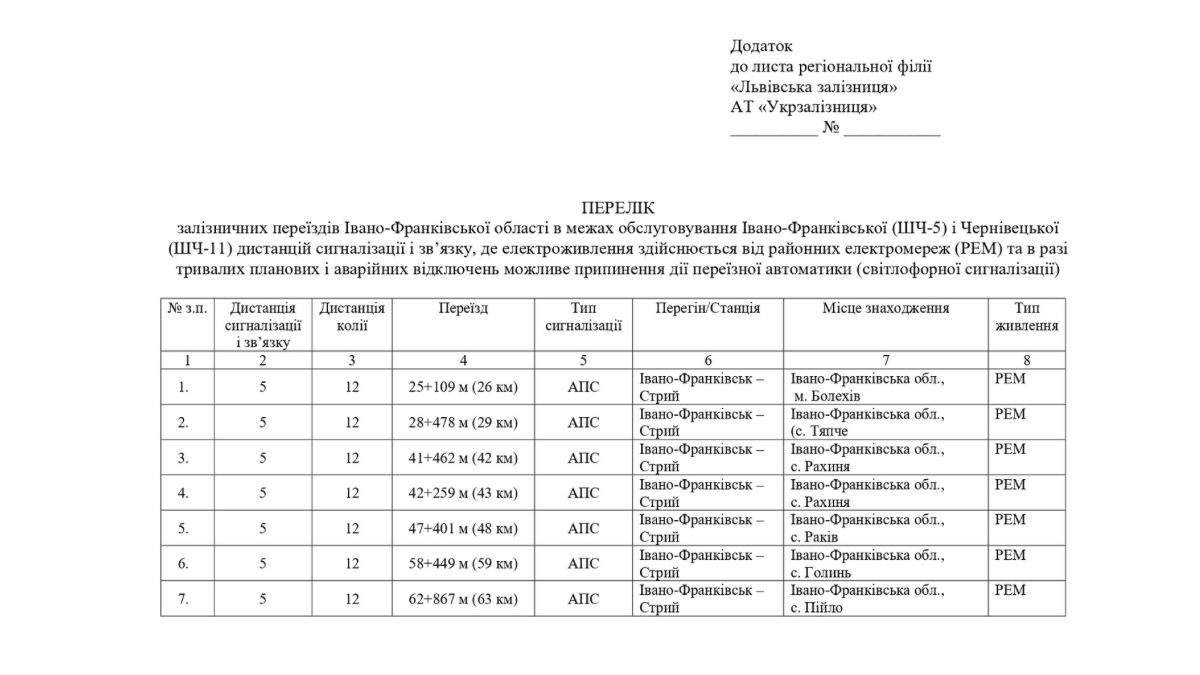Перелік залізничних переїздів, де електроживлення здійснюється від районних електромереж (РЕМ) та в разі тривалих планових і аварійних відключень можливе припинення дії переїзної автоматики (світлофорної сигналізації).