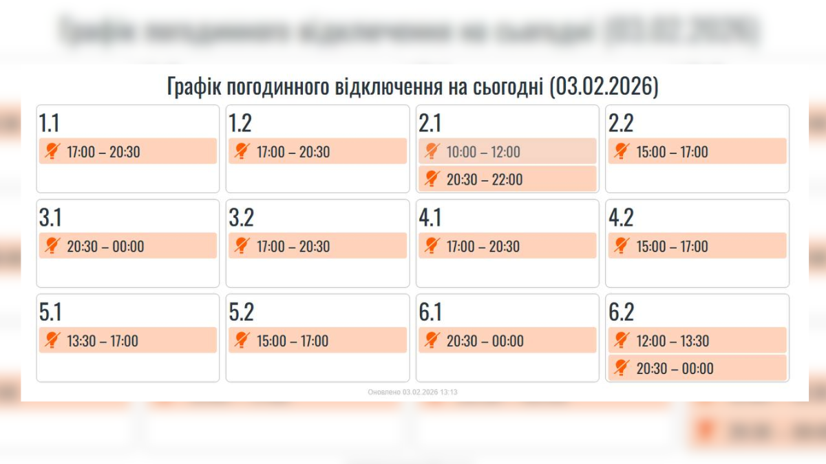 Нижче наводимо графік відключень на 3 лютого. Оновлення станом на 13:15 03.02.2026р.