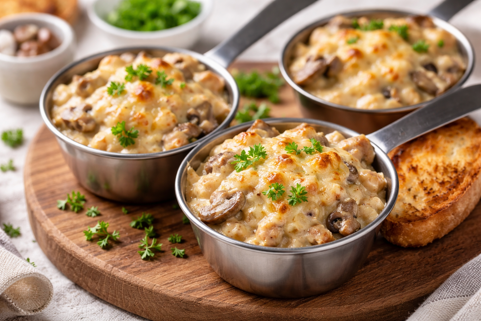 Готовий соус переливають до курки з грибами, ретельно перемішують і прогрівають ще кілька хвилин. Суміш розкладають у кокотниці або жаростійкі формочки, щедро посипають тертим сиром і відправляють у духовку, розігріту до 180 °C, на 10–15 хвилин — до появи апетитної рум’яної скоринки.