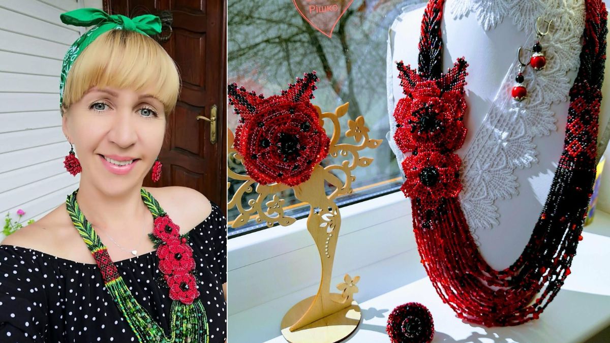 «Спочатку я рахувала свої перші роботи, а згодом перестала, бо їх стало дуже багато. Думаю, понад дві тисячі точно є. Десять років тому я побачила вироби з бісеру, почала шукати техніки в інтернеті, вчитися, вигадувати власні дизайни. Роблю брошки, намиста, ґердани, працюю з натуральним камінням і коралом, обшиваю кабошони. Мої прикраси часто універсальні: одна річ може бути і брошкою, і підвіскою. Використовую тільки якісний японський бісер із ексклюзивним блиском, що не стирається», — розповідає Оксана Рішко.