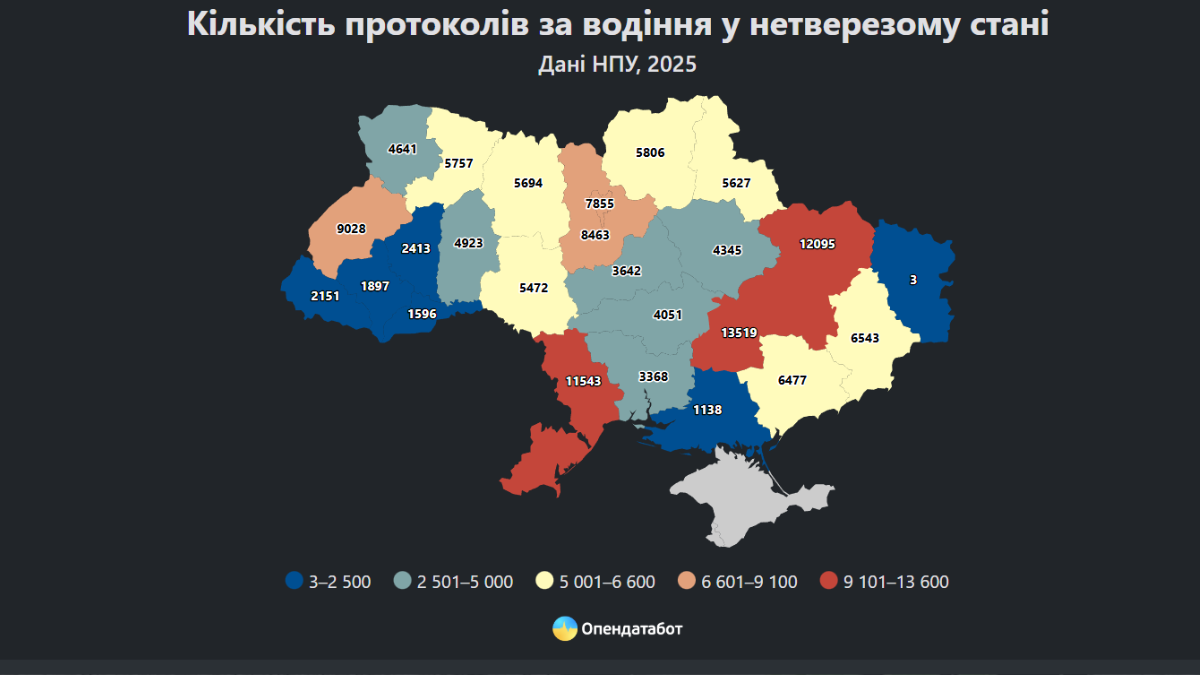 Кількість протоколів Нацполіції України за водіння у нетверезому стані у 2025 році. Графіка Опендатабот