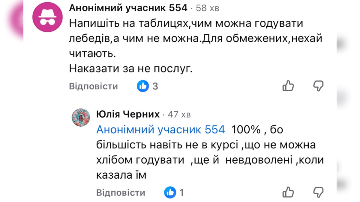 В коментарях також висувають пропозиції щодо встановлення інформаційного стенду з роз’ясненням, чим можна, а чим категорично не можна годувати птахів, аби уникнути подібних випадків у майбутньому.