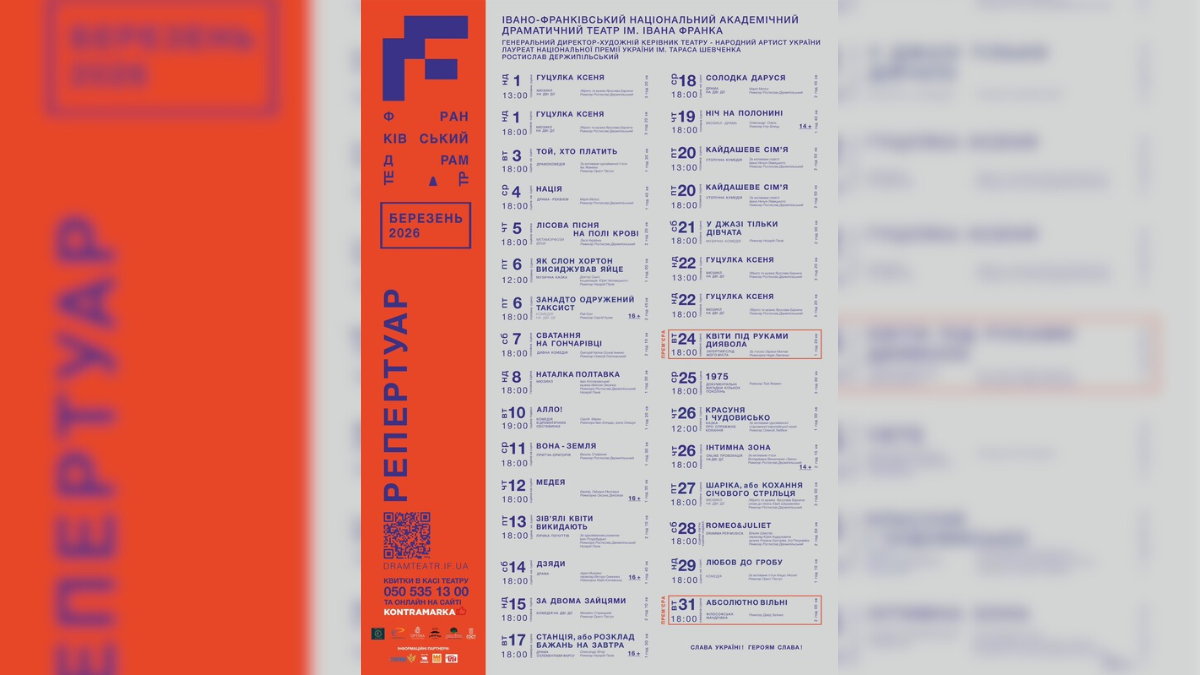 Протягом березня в Івано-Франківському драмтеатрі покажуть 31 виставу. Серед них — «Гуцулка Ксеня», «Кайдашева сімʼя» та «Солодка Даруся».