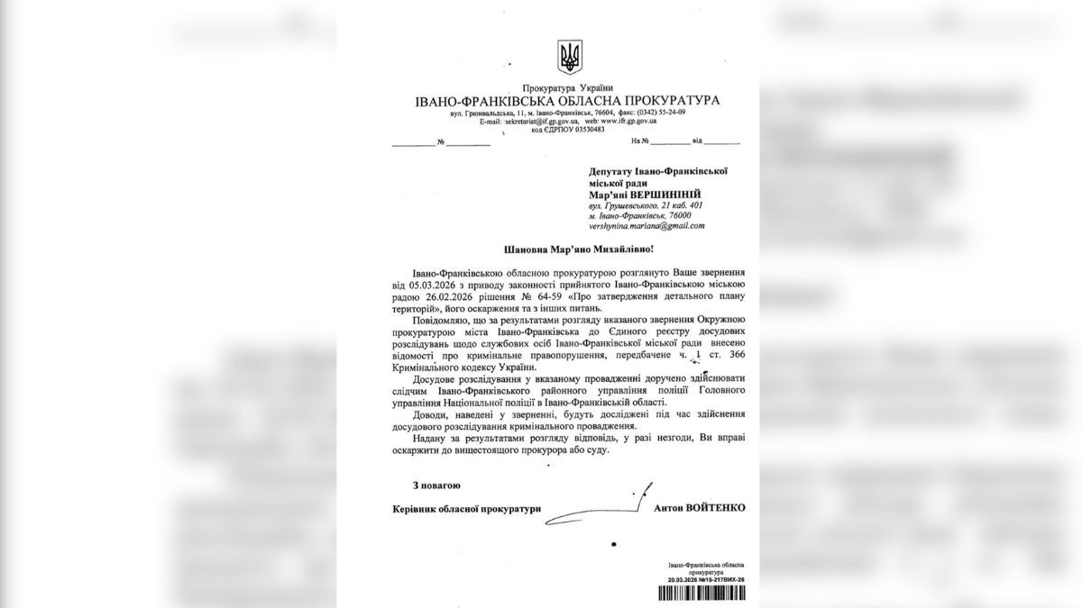 Відповідь Івано-Франківської обласної прокуратури на звернення депутатки Мар’яни Вершиніної. Фото: Фейсбук-сторінка Мар’яни Вершиніної