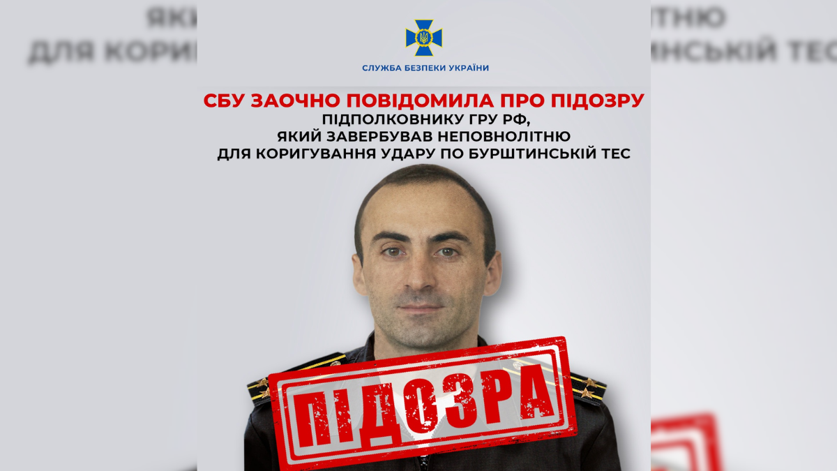 Служба безпеки України заочно повідомила про підозру підполковнику російської воєнної розвідки Марату Цевелеву, який завербував неповнолітню для коригування удару по Бурштинській ТЕС.